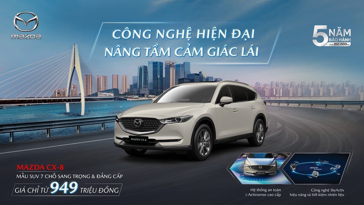 Mazda CX-8 khẳng định đẳng cấp ưu đãi 10 triệu cho tất cả các phiên bản. Mazda CX-8 sở hữu không gian nội thất rộng rãi với chiều dài cơ sở lớn nhất phân khúc D-SUV 7 chỗ, sử dụng công nghệ SkyActiv có kích thước nhỏ gọn, hiệu năng cao. Đây cũng là mẫu xe được nhiều doanh nhân ưa chuộng khi có tùy chọn 6 chỗ, hàng ghế thứ 2 được bố trí độc lập với bệ tỳ tay ở giữa cùng loạt trang bị cao cấp như da Nappa, loa Bose, điều hòa 3 vùng độc lập, cửa sổ trời,…